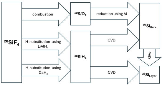 Historically, further processing of 28SiF4 has been a challenge, which often only was solved by international cooperation. Also, up to this day, no stable and commercially viable method has been introduced. The earliest reported source mentioning pure 28Si was an American experiment, which was vague about its origin [11]. Unfortunately, no details are given as to how it was produced. The enrichment was probably carried out using a cyclotron, and from there, the simplest possible further processing was used: 28SiO2 was produced by combustion, which was then reduced with Al powder [12]. When isotope-pure silicon regained interest at the beginning of the 1990s, this process was taken up again. However, there were disadvantages: high losses, heavy contamination with Al, and only bulk 28Si as a product. Alternative routes that produced 28SiH4 as a final or intermediate product were introduced: H-substitution with metal hydrides such as CaH2, LiAlH4, and NaH.