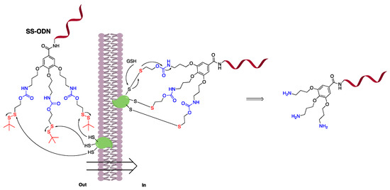 Brief description of disulfide unit-masked oligonucleotide (SS-ODN) strategy used. The red marks represent disulfide unit reaction parts. The blue marks represent prodrug release parts.