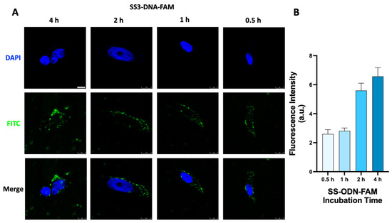 (A) CLSM images of HeLa S3 cells after different incubation times with 1 μM SS-ODN-FAM probe. Nuclei were stained with DAPI. (B) Quantitative analysis of fluorescence intensity. Scar bar: 8 µm. The blue marks represent DAPI staining. The green marks represent the fluorescent signal of FAM.