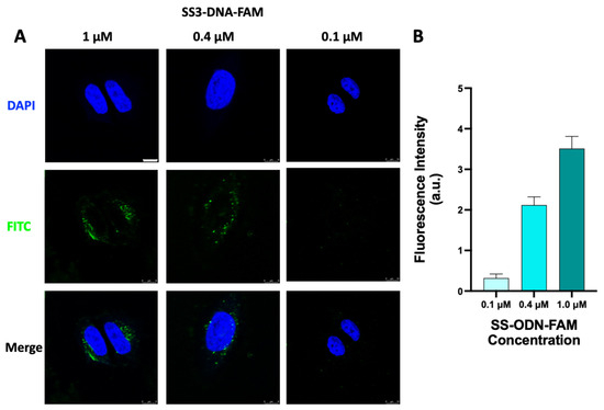 (A) CLSM images of HeLa S3 cells after 1 h incubation with different concentrations of SS-ODN-FAM probe. Nuclei were stained with DAPI. (B) Quantitative analysis of fluorescence intensity. Scar bar: 8 µm. The blue marks represent DAPI staining. The green marks represent the fluorescent signal of FAM.