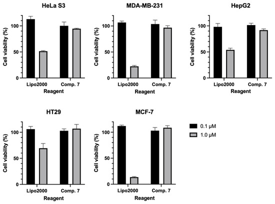 The various cancer cells (HeLa S3, MDA-MB-231, HepG2, HT29, and MCF-7, 3000–5000 cells/well) were seeded onto a 96-well plate (Labselect, Hefei, China) and grown in a complete medium (DMEM, high glucose, 10% FBS, 1% antibiotics, 100 µL) 24 h before probe treatment. The cells were treated with 7 (0.1 and 1.0 µM, 100 µL) and Lipo2000 (2 equivalent of corresponding ODN, 100 µL), respectively, in DMEM at 37 °C for 72 h. The medium was removed, and 20 μL of CCK-8 solution (Adamas life, Shanghai, China) was added to each plate; the cells were then incubated at 37 °C for 4 h. A multifunctional microplate reader (Synergy H1, Bio-Tek, Winooski, VT, USA) was used to record the absorbance of the solution in each well at 450 nm.