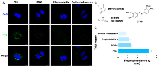 (A) CLSM images of HeLa S3 cells that were preincubated with thiol reagent (1.2 mM, 0.5 h), then incubated with an SS-ODN-FAM probe (1 μM, 1 h). The nuclei were stained with DAPI. (B) The detailed structure of different thiol reagents, such as ethylmaleimide, sodium iodoacetate, and DTNB. (C) Quantitative analysis of fluorescence intensity. Scar bar: 8 µm. The blue marks represent DAPI staining. The green marks represent the fluorescent signal of FAM.