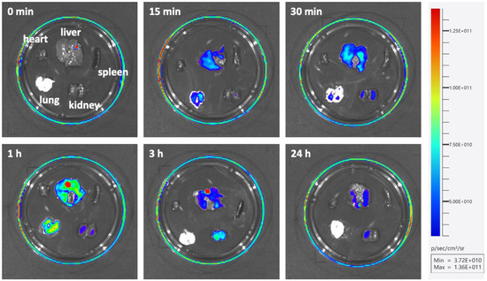 Finally, in order to observe the distribution of the SS-ODN-FAM probe in vivo, animal experiments were performed using mice. The SS-ODN-FAM probe (200 μL, 5 mg/kg) was injected into male TCR mice (six weeks old) by tail vein injection, and uninjected mice were used as controls. Mice were sacrificed at the indicated time points after administration (15 min, 30 min, 1 h, 3 h, and 24 h) and all major organs (heart, liver, spleen, lung, and kidney) were collected for fluorescence imaging using the Tanon ABL-X5 Pro Small Animal Live Imaging System. It was found that the probe was rapidly enriched in the liver and lung organs (15 min, Figure 7) after injection, peaking at around 1 h. It was then metabolized and excreted via the kidneys. The probe in the lungs was first metabolized rapidly, leaving essentially no residue after 3 h, when renal work intensified to complete probe excretion. The metabolism of the probe in the liver was relatively slower, and some traces of the probe could still be found in the liver 24 h after injection. Correspondingly, this was accompanied by little metabolism in the kidneys. The distribution of the probe was largely absent in the heart and spleen. These results suggest that the disulfide unit-masked system has the potential to deliver oligonucleotide drugs that can silence genes associated with lung and liver diseases well, especially in the liver site.