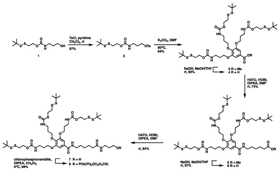 - Synthesis of bis(2-(tert-butyldisulfaneyl)ethyl) (((2-(3-(((2-(tert-butyldisulfaneyl)ethoxy)carbonyl)amino)propoxy)-5-((6-((3-(((2-cyanoethoxy)(diisopropylamino)phosphaneyl)oxy)propyl)amino)-6-oxohexyl)carbamoyl)-1,3-phenylene)bis(oxy))bis(propane-3,1-diyl))dicarbamate (8)