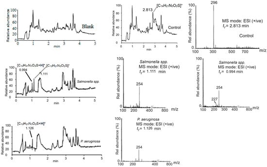 The total ion chromatograms (TICs) and the respective mass spectra obtained by positive-ion electrospray mass spectrometry are depicted in Figure 1. The void volume of the column was noted to be 0.24 mL. A careful viewing of the TICs revealed the appearance of new peaks at 0.994 min (Salmonella spp.), 1.111 min (Salmonella spp.), 1.126 min (B. subtilis, P. aeruginosa), 1.333 min (B. subtilis) and 1.214 min (S. aureus). These peaks were also observed in the chromatograms obtained by the PDA detector that confirmed the correct working of the system. The fragmentation patterns of these metabolites are listed in Table 1. We attempted to calculate some of the important properties with well-known computational software (T.E.S.T Version 5.1.2 and SwissADME); these are listed in Table 2.