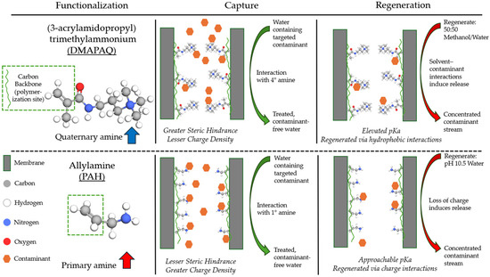 Membranes as separation systems are capable of size exclusivity by virtue of their porous structure, and these pores can be further functionalized to act as a channel of active sites through which water is passed [37,38,39]. When the pores are functionalized, convective flow bolsters the mass transfer kinetics of potential contaminants to boost the overall performance of the separation process. Localized polymerization within the pore network of the membrane is capable of this combined performance benefit. Polymeric membranes functionalized in this way can also introduce stimuli-responsive properties [37].