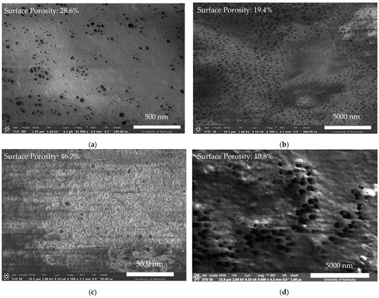 Surface imaging and cross-sectional analysis were conducted using a focused ion beam/scanning electron microscope (FIB/SEM) dual beam (Helios Nanolab 660, FEI/ThermoFisher Scientific, Waltham, MA, USA). Surface porosity analysis was performed using ImageJ particle analysis calculations.