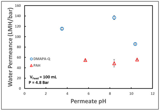Effect of feed pH on water permeance. Permeation operated in dead-end batch conditions. pH adjusted with hydrochloric acid or sodium hydroxide. Error bars represent +/− one standard deviation in series of permeance measurements, n = 3.