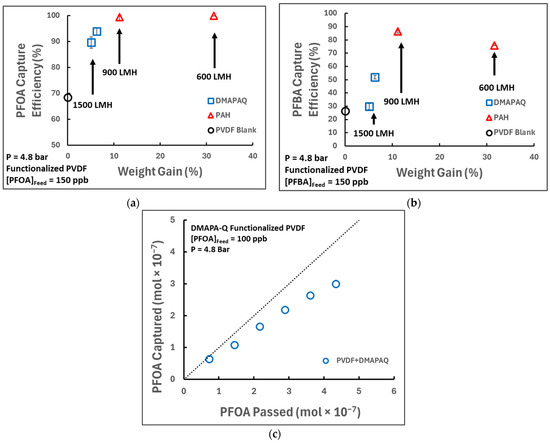 PFOA/PFBA capture by primary and quaternary amine-functionalized PVDF650 membrane and pristine PVDF650 blank membrane using dead-end batch filtration. Capture efficiency is defined as ((feed concentration—permeate concentration)/feed concentration) × 100%. Permeate represents 30% water recovery. (a) PFOA capture efficiency; (b) PFBA capture efficiency; (c) PFOA capture efficiency during processing; dotted 45° line represents capture efficiency of 100%. Error bars represent +/− one standard deviation using technical triplicates; for PVDF blank capture, n = 1.
