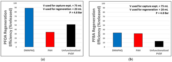 The regeneration efficiency reflects the ability for each membrane to release the captured contaminant. When PFOA was passed through each membrane, the functionalized membranes were able to capture more than the unfunctionalized PVDF membrane. Based on experimental data with a 120 ppb (120,000 ng/L) feed and 75 mol water permeation through 14.6 cm2 membrane, the DMAPAQ and PAH were able to capture 7.4 µg and 9 µg of PFOA compared to the pristine PVDF capture of 5 µg. When regenerated, the DMAPAQ, PAH, and pristine membranes produced concentrates of PFOA at approximately 328 ppb, 152 ppb, and 128 ppb, respectively. While the PAH-functionalized membranes exhibited the highest rates of capture, the regenerating feed solution seems to not be sufficient for optimum release. For PFBA, both quaternary and primary amine-functionalized membranes exhibited regeneration efficiencies greater than pristine PVDF microfiltration membranes, resulting in regeneration stream concentrations of 57.5 ppb, 138.5 ppb, and 8.5 ppb, respectively. Of course, these concentrations depend on the amount captured. Here, it seems the shorter-chain PFBA is less amenable to methanol and water recovery. The PFOA results could be indicative of how the lengthened hydrophobic carbon chain plays an increased role in interactions with the membrane, as opposed to the lesser carbon chain of PFBA, where its charge could see a larger relative impact.