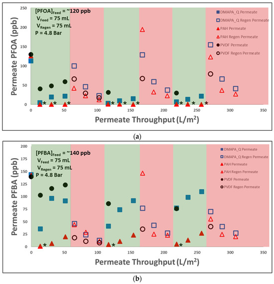 Capture and controlled release of (a) 120 ppb PFOA solution and (b) 140 ppb PFBA solution in functionalized and pristine membranes. Filled-in symbols indicate concentration of PFASs detected in permeate. Open symbols indicate concentration of PFAS detected in the regeneration stream. Green region indicates permeate from ~130 ppb PFOA/PFBA mixture, red region indicates permeate from regeneration stream. DMAPA-Q and PAH membranes were regenerated with 50:50 methanol/water mix and water adjusted to pH 10.5, respectively. All permeations were performed at 4.8 bar under neutral conditions, n = 1. * Denotes measurement below instrumentation limit of quantification.