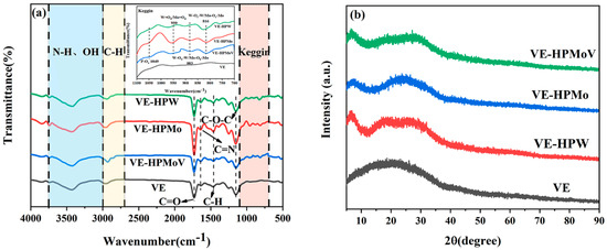 (a) FT-IR spectra of VE, VE-HPW, VE-HPMo, and VE-HPMoV and (b) XRD patterns of VE, VE-HPW, VE-HPMo, and VE-HPMoV. Different colors represent different samples.
