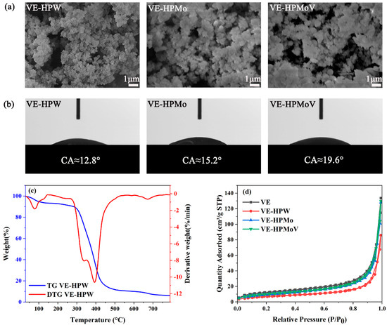 (a) SEM images of VE-HPW; VE-HPMo; VE-HPMoV. (b) Contact angle on surface of VE-HPW; VE-HPMo; VE-HPMoV. (c) TG and DTG curves of VE-HPW. (d) N2 adsorption–desorption isotherms.