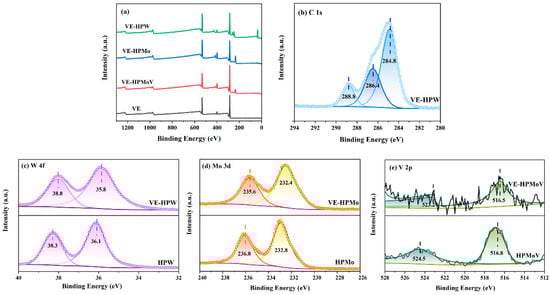 XPS spectra of (a) survey; (b) C 1s of VE-HPW; (c) W 4f of VE-HPW and HPW; (d) Mo 3d of VE-HPMo and HPMo; (e) V 2p of VE-HPMoV and HPMoV. Different colors represent chemical states of the catalysts.