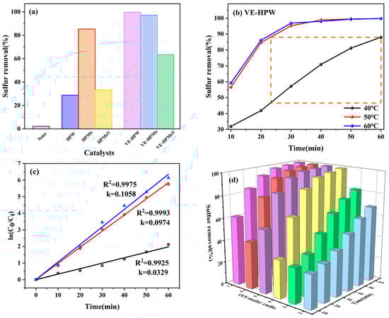 To investigate the impact of various reaction conditions on desulfurization efficiency, the oxidative desulfurization activities of the catalysts are illustrated in Figure 4. Without catalysts, the desulfurization efficiency of H2O2 is only 2.1%. In comparison to HPW, HPMo, and HPMoV, the desulfurization rates of VE-HPW, VE-HPMo, and VE-HPMoV are significantly improved (Figure 4a). Under the same conditions, VE-HPW achieves 97.7% removal of DBT at 50 °C within 60 min.