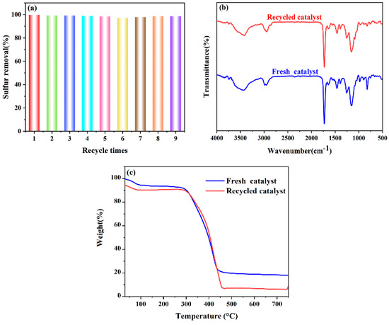 The cycle performance is an important criterion for investigating the pros and cons of the catalysts. It also determines the prospect of the catalysts in industrial applications. VE-HPW is taken as an example to further test its reuse efficiency. The upper layer of clarified oil in the reaction flask was removed after every ODS reaction. The reaction flask was dried in a drying oven at 65 °C for 24 h to obtain the catalyst, which was then reused in subsequent catalytic cycles under the same reaction conditions. As shown in Figure 5a, the catalyst still achieved a sulfur removal capacity of 98.60% after the ninth recycling. This indicates that the catalyst maintains a stable structure under the conditions studied, demonstrating satisfactory reusability in oxidative desulfurization processes.