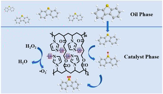 Polyvinylimidazole is formed by repeated covalent bonds of 1-vinylimidazole. Therefore, the polymer surface has a number of binding sites. More importantly, the nitrogen on the imidazole group can be complexed with a variety of substances [29]. The resulting catalyst has better dispersibility, which achieves higher catalytic efficiency. Xu et al. prepared microsphere ionic liquid catalysts through polyvinylimidazole, 1-chlorobutane, and cobalt chloride. The catalysts can remove more than 99% of DBT in a short time [30]. Yang et al. used vinyl imidazole with different carbon chain lengths to polymerize and self-assemble with ammonium molybdate and achieved the effect of deep desulfurization after 90 min of reaction [31].