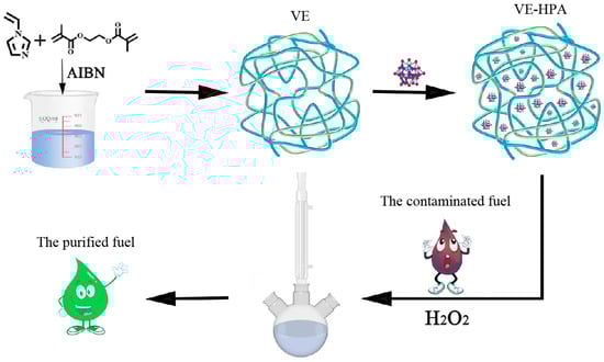1-Vinylimidazole (99%), phosphotungstic acid hydrate (AR), and tetradecane (AR, 99%) were received from Aladdin, China. Ethylene glycol dimethacrylate (98%), acetonitrile (≥99.9%), phomolybdic acid hydrate (AR), vanadium (V) oxide (99.99%), molybdenum trioxide (AR, 99.5%), phosphoric acid (AR, purity ≥ 85 wt.% in H2O), 1-methyl-3-octylimidazolium tetrafluoroborate (Moim+BF4−) (98%), dibenzothiophene (DBT, 99%), octane (>99%), and p-benzoquinone (≥99.5%) were all purchased from Shanghai Macleans Biochemical Technology Co., Ltd. Ethanol (≥99.7%) and hydrogen peroxide (30 wt%) stemmed from Xilong Chemical Co., Ltd., Tianjin, China 2,2′-Azobis(2-methylpropionitrile) was supplied by Tianjin Guangfu Fine Chemical Research Institute. Tert-butanol was obtained from Fuchen Chemical Reagent Co., Ltd., Tianjin, China. All chemical reagents were used directly without further purification.
