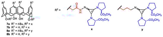 The four tetraprolinate calix[4]arene derivatives 7a,b and 8a,b (Figure 3) equipped with two “superbase” cyclopropenimine moieties at the lower rim were described by Yilmaz and co-workers in 2022 [35]. The compounds 7a,b were synthesised from p-tert-butylcalix[4]arene and calix[4]arene, respectively, through conversion of the starting compounds into diesters by reaction with bromomethyl acetate. For the synthesis of calix[4]arenes 8a,b, treatment with N-(3-bromopropyl)phthalimide yielded the corresponding bis(phthalimidopropoxy) derivatives. In the second step, the four precursors were reacted with hydrazine to obtain bis-hydrazide or bis-amino-calixarenes, respectively. In the final step, the addition of dimethyl(3 chlorocycloprop-1-ene-1,2-diyl)di-L-prolinate led to the target compounds 7a,b and 8a,b in 55–75% yield. In vitro assay conducted on five human cancer lines (DLD-1, A-549, HEPG2, PC-3, PNT1A) revealed that these compounds exhibit antiproliferative activity with IC50 values ranging from 4.7 to 288.3 μM. Notably, the most active compound (8a) demonstrated significantly higher cytotoxicity against DLD-1 (human colon cancer) and PC-3 (human prostate cancer) compared to the normal human epithelial cell line PNT1A, showing greater promise than simple calixarene-proline derivatives. However, a tendency of these superbase compounds to decompose in solution was also observed, which could pose significant challenges to their stability and practical application.