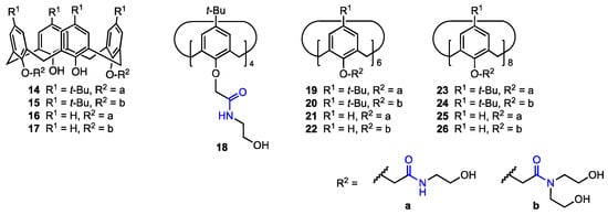 In 2016, Yan and co-workers [38] developed a route toward calix[n]arenes (n = 4, 6, 8) bearing multiple ethanolamine or diethanolamine units at the lower rim (14–26, Figure 5). Five calix[4]arene, four calix[6]arene, and four calix[8]arene derivatives were prepared and characterised by spectroscopic analyses, with the X-ray structure of one calix[4]arene derivative also obtained. Preliminary cytotoxicity assays performed on six cancer cell lines (A549, SKOV3, SW1990, Hela, Raji, MDA-MB-231) indicated that the larger macrocycles, i.e., the calix[6]arene and calix[8]arene derivatives, were generally inactive, likely due to their inability to permeate the cell membrane. Among the calix[4]arenes, those bearing tert-butyl groups at the upper rim proved to be more effective, showing IC50 values in the low μM range for all tested cell lines. Further studies on human ovarian carcinoma cells (SKOV3) revealed that these compounds induce cell apoptosis through the up-regulation of the Caspase 3 and p53 proteins.