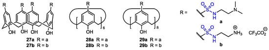 Water-soluble calix[4]arene, calix[6]arene, and calix[8]arene sulfonamide analogues (Figure 6) were prepared by Bayrakci and co-workers [39] as potential anticancer agents. They were obtained from the corresponding tetra-, hexa- or octa-p-tert-butylcalix[n]arenes (n = 4, 6, 8) by reaction with chlorosulfonic acid, and the resulting chlorosulfonated derivatives were treated with either N,N′-dimethylethylenediamine or N-Boc-ethylenediamine. Boc-protected sulfonamides were then converted into quaternary ammonium salts. The structures and cone conformations of the new calixarenes were confirmed by NMR analysis, while the FT-IR spectra proved the presence of the sulfonamide group. All the six calixarene derivatives were moderately cytotoxic toward MCF-7 and MIA PaCa-2 cancer cell lines, with compound 29a exhibiting the best selectivity for malignant cells (epithelial cell line HEK293 was used as a reference).