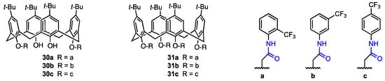 In 2022, Oguz [40] described a series of p-tert-butylcalixarenes with trifluoromethyl aniline groups as potential anticancer agents. The trifluoromethyl moiety can improve pharmacokinetic properties of organic compounds, such as binding affinity and membrane permeability [41]. The p-tert-butylcalix[4]arenes were functionalised with trifluoroanilines to obtain di-amide (30a–c) and tetra-amide (31a–c) derivatives (Figure 7). Their cytotoxicity against MCF-7 (breast cancer), A549 (lung cancer), HeLa (cervical cancer), HEp-2 (containing HeLa marker chromosomes), and Vero (healthy kidney epithelial cells) cell lines was assessed using the Alamar Blue assay and compared with the cytotoxicity of 5-fluorouracil (5-FU), a well-known clinical antitumoural agent [42].