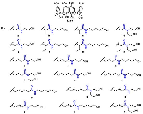 An, Zheng, and their co-workers [46] synthesised twenty calix[4]arene-based carbonyl amide derivatives (32a–t, Figure 8) and studied their anticancer activity against A549, MCF-7, MDA-MB-231 (breast cancer), HT29 (colon carcinoma), and HepG2 (hepatocellular carcinoma) human cancer cell lines, as well as cytotoxicity against HUVEC cells. Some derivatives were found to be active against all five cancer cell lines (MTT assay). In particular, compound 32h displayed inhibition rates of 90.4%, 64.2%, 89.6%, 88.2%, and 90.7% against MCF-7, HT29, HepG2, MDA-MB-231, and A549, respectively, at 10 μM (5 h), and also showed good resistance against HUVEC cells (9.6% inhibition rate). Compared to the previously published [38] calix[4]arene 14 (see Figure 5) bearing simple N-hydroxyethyl-amide groups, 32h displayed activity that was 3.2 times higher against A549 and 6.8 times higher against MDA-MB-231. Based on the inhibitory activity of other derivatives, it was determined that as the length of the alkyl chain between the oxygen atom in the phenolic hydroxy group and amide at the lower rim increases, the activity decreases drastically, and as the steric hindrance between the lower phenolic hydroxyl group and amide increases, the activity also increases. Since compound 32h showed low cytotoxicity against healthy human cells while displaying IC50 values of 1.20 μM (A549) and 0.66 μM (MDA-MB-231), it appears to be the most promising anticancer drug candidate. The mechanism of inhibition was further determined—it was shown in a wound-healing assay that the derivative hinders cell migration of MDA-MB-231 (with the cell migration being prevented to a higher extent as the concentration increases). Apoptosis was also investigated, as the MDA-MB-231 cells were stained with Hoechst 33342, and the cells displayed signs of apoptosis under various concentrations of 32h, thus suggesting that it has a pro-apoptotic effect. This activity was investigated by flow cytometric analysis, which indicated that the addition of the compound may induce cell death and block the G0/G1 phase of the cell cycle. The calixarene derivative induced the activation of caspase-3 (an executive molecule in apoptosis regulation) in the MDA-MB-231 cells, with the concentration of activated caspase-3 increasing as the concentration of the derivative increased. Additionally, the presence of 32h induced the expression of Bax protein, which is pro-apoptotic, and hindered the expression of Bcl-2 protein (anti-apoptotic). It can thus be concluded that 32h is a potential antitumour drug, since it has a high anti-proliferative ability and can possibly induce apoptosis in the cancer cells, not just inhibit proliferation.