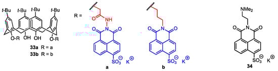 Yilmaz and co-workers [47] synthesised two fluorescent calix[4]arenes bearing 4-sulfo-1,8-naphtalimide moieties linked at the lower rim through hydrazide (33a) or aminopropyl (33b) chains (Figure 9). It has already been proven that calix[4]arenes are effective against human ovarian carcinoma cells [48], and 1,8-naphthalimide derivatives can be used not only as supramolecular building blocks and smart materials but also as biological probes [49,50] and active compounds against breast, cervical, prostate, and epidermal carcinoma cells [51,52,53]. The calixarenes 33a and 33b were tested for their activity using a DLD-1 colorectal adenocarcinoma cell line and healthy colon epithelial cells (CCD-18Co). IC50 was found to be 12.95 μM for 33a and 16.13 μM for 33b against the DLD-1 cell line. On the other hand, for the healthy cell line, the IC50 values were 508 μM (33a) and 269 μM (33b), which means that the proliferation of the normal cells was not affected by the calixarene derivatives. At the same time, it was assessed that the mechanism of action of the compounds was cytotoxic, not cytostatic, as the number of cells was reduced after treatment. Additionally, the activity of N,N-dimethylaminoethyl-4-sulfo-1,8-naphthalimide 34 was evaluated against the DLD-1 cell line, and no significant effect was observed. Therefore, the increase in activity when the naphthylimide is bound to the macrocyclic scaffold indicates that the calix[4]arene plays a vital role in cell death.