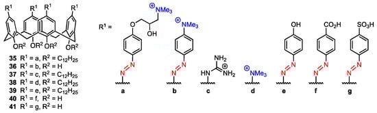 Shi, Guo, Liu, and co-workers [54] reported the synthesis and properties of the quaternary ammonium salt azocalix[4]arene 35 (Figure 10) that was proved to drive immunogenic cell death (ICD) and could potentially be used in cancer immunotherapy, as well as be used alongside anticancer drugs to improve their performance via host–guest bonding. The other analogues (36–41, Figure 10) were synthesised to assess the impact of the structure of the compound on ICD-inducing activity.