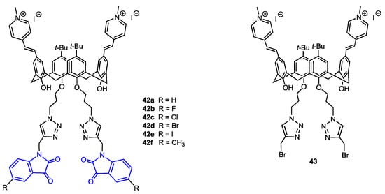 Yilmaz and co-workers [56] developed a route to calix[4]arenes bearing two methylpyridinium cations at the upper rim and two isatin moieties attached to the lower rim (Figure 11). These derivatives were targeted to the mitochondria of cancer cells. The synthesis started with bis-formylation of upper rim aromatic rings followed by a reaction with 1,4-dimethylpyridinium iodide. At the lower rim, two azide-functionalised arms were linked to the hydroxyl groups, then, CuAAC reaction with six propargylated isatin derivatives gave the desired compounds 42a–f. The triazole derivative 43 lacking isatin pharmacophore was prepared as well, using propargyl bromide in the last step. The compounds were evaluated for their antiproliferative activity against two types of breast cancer cells, MCF-7 and MDA-MB-231, and a human normal epithelial cell line PNT1A. The observed IC50 values were in the 3–20 μM range, in most cases lower than that displayed by 5-fluorouracil used as a reference. The isatin-bearing derivatives were more active in comparison to the compound 43 which, however, exhibited some cytotoxicity due to the presence of 1,2,3-triazole moiety. The toxicity toward the healthy cells was lower for all derivatives, the IC50 being 4–18 times smaller than for malignant cells. The confocal microscopic study revealed the localisation of compound 42c in the mitochondria of MDA-MB-231 cells. This compound was also identified as a good apoptotic agent and a potent inhibitor of aromatase enzyme, which is also a target in breast cancer therapy.