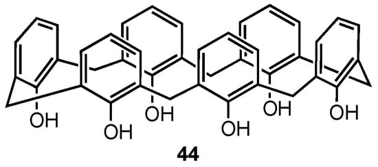Ferreira-Halder and co-workers have been exploring the use of unsubstituted calix[6]arene 44 (Figure 12) for the treatment of pancreatic cancer since 2013, initially reporting that 44 was more potent than both gemcitabine and 5-fluorouracil in reducing the viability of the drug-resistant human pancreas carcinoma Panc-1 cell line [57]. Moreover, calix[6]arene was able to suppress the signal transduction of the Mer and AXL tyrosine kinase receptors, which are overexpressed in this type of cancer. In 2020, they further demonstrated that 44 induced the degradation of the AXL receptor tyrosine kinase in Panc-1 cells via clathrin-mediated endocytosis [58]. Furthermore, they found that 44 could inhibit the migration and invasion of Panc-1 cells by downregulating FAK (a downstream mediator of AXL) activity and reducing the expression of the matrix metalloproteinases MMP-2 and MMP-9, which are responsible for initiating metastasis of cancer cells. In a 2024 study, the same research team evaluated the potential of calix[6]arene 44 not only to decrease the activity of MMP-2 and MMP-9 but also to prevent the release of extracellular vesicles (EVs) [59]. EVs induce metastasis by promoting intercellular communication and enhancing carcinogenesis, making them an interesting target for treatment strategies. Experiments were conducted using two pancreatic cancer cell lines, PANC-1 and MIA PaCa-2. Western-blot analysis revealed that PANC-1 cells exhibited a higher expression of proteins involved in EV secretion and contained a higher concentration of EVs compared to the MIA PaCa-2 cell line. It was found that the calix[6]arene reduced both the viability of pancreatic cells themselves and the release rate of EVs by PANC-1 cells at subtoxic concentrations (5 µM), suggesting that 44 is capable of preventing EV biogenesis. After treatment with a 10 µM solution of 44, MMP-2 and MMP-9 expression was reduced in both pancreatic cancer cell lines, indicating that calix[6]arene is able to reduce MMP activity but only at high concentrations that may make it not viable for human treatment. Nevertheless, the ability of calix[6]arene 44 to prevent EV production makes it a promising candidate for alternative cancer treatments.