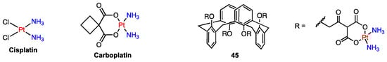 Cisplatin and carboplatin, despite being well-known anticancer drugs, suffer from short blood circulation times due to their low molecular weight, leading to reduced tumour uptake and limited intracellular binding. To address this issue and aim to increase the half-life of the platinum complexes, Pur and Dilmaghani prepared the water-soluble tetra-platinum(II) complex 45 (Figure 13) from a calix[4]arene in 1,3-alternate conformation functionalised with four malonate moieties [60]. In vitro tests demonstrated that 45 was more cytotoxic against three human carcinoma cell lines (HepG2, MCF7, A549) compared to carboplatin and three other monomeric platinum complexes, suggesting its potential as a more effective anticancer agent.
