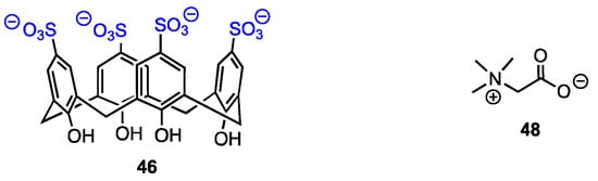 El-Said Azzazy and co-workers [62] reported on an efficient enhancement of the antiproliferative activity of betaine (trimethylglicine, 48) after complexation with p-sulfonatocalix[4]arenes 46 (Figure 15). This work was based on the fact that betaine required high doses to show anticancer action. Its introduction into cancer cells in the form of an inclusion complex opened the possibility of increased concentration; the acidic environment of tumour tissue should result in drug release. The formation of a host–guest complex was confirmed by the upfield shifts of betaine protons observed in the 1H NMR spectrum and also by changes in the UV-Vis spectrum. The authors deduced a 1:1 stoichiometry of the complex from Job’s plot and found the value of the stability constant as 8.9 × 104 M−1. A DFT study was performed to establish possible complexation modes. Finally, in vitro tests proved that while free betaine and 46 were not cytotoxic against MCF-7 and HeLa cell lines, the inclusion complex exhibited IC50 in the μg mL−1 range.