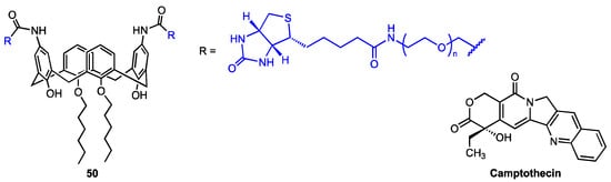 Recently, An and co-workers [64] developed a supramolecular nanodelivery system for the highly toxic quinoline alkaloid camptothecin (CPT) based on the calix[4]arene derivative 50 (Figure 17), which features two biotin-PEG moieties at the upper rim (the actual length of the PEG chain was not known). The functionalised calixarene 50 exhibited a tendency to form micelles which efficiently encapsulated CPT, as proven by transmission electron microscopy and dynamic light scattering analyses. The drug release was found to be strongly pH-dependent. In vitro MTT assay revealed that CPT cytotoxicity against normal human endothelial cells (HUVEC) was significantly decreased by drug encapsulation (bringing it down to the level of the carrier itself, which was practically harmless). On the other hand, the IC50 value for CPT-50 micelles (8.77 μM) was only slightly higher than that for the free camptothecin (8.03 μM) against the malignant cells (mouse breast cancer cells 4T1). The proapoptotic, concentration-dependent effect of the CPT-50 micelles was further confirmed by annexin-FITC/PI staining.