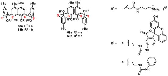 In 2022, Akhmedov, Stoikov, and their co-workers [68] reported the regioselective functionalisation of thiacalix[4]arene with a fluorescent label in order to obtain compounds with antiangiogenic activity that would act as galectin-1 inhibitors (Figure 19). These compounds were synthesised using as a reference the structure of anginex, a 33 amino acid peptide which is the most powerful galectin-1 inhibitor. In previous works, the hydrophilic and lipophilic fragments of anginex were taken into account, and some nonpeptidic surface topomimetics were synthesised by Dings and co-workers, including two calixarene-based compounds which proved to be potent angiogenesis inhibitors [69]. The whole series of functionalised macrocycles was then patented due to their antibacterial, antiangiogenic, and antitumour activity [70]. Akhmedov, Stoikov, and their co-workers envisaged the combination of the antiangiogenic drugs with diagnostic agents in order to obtain theranostic compounds. These researchers obtained thiacalix[4]arenes containing fluorescein fragments in both cone (68a) and 1,3-alternate (69a) blocked conformations. Additionally, the analogues containing a phenylthiourea moiety (68b, 69b) were prepared to study the effect of the fluorescein unit on the cytotoxicity of the macrocycles.