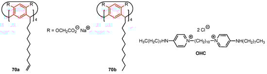 In 2022, Kashapova and co-workers [72] explored the use of calix[4]resorcinol (calix[4]resorcinarene) scaffolds to develop self-aggregating systems incorporating octenidine dihydrochloride (OHC) as potential anticancer drugs. OHC is a commercial surfactant known to be an antimicrobial and anticancer agent; however, it is also highly toxic to healthy human cells. The two calix[4]resorcinol derivatives 70a and 70b (Figure 20), functionalised with eight negatively charged acetate groups at the upper rim and lipophilic chains at the lower rim, were mixed with octenidine dihydrochloride to obtain spherical nanoparticles (~100 nm by TEM microscopy) which were expected to display higher selectivity toward cancer cells compared to the standalone surfactant. The cytotoxicity of 70a, 70b, OHC, OHC–70a, and OHC–70b (with 6:1 and 12:1 OHC to calix[4]resorcinol ratios used to form the aggregates) was evaluated against the MTT (human cervical carcinoma), HuTu (human duodenal adenocarcinoma), MCF-7, and A549 cancer cell lines, as well as the healthy Chang liver cell line. The calix[4]resorcinol derivatives 70a and 70b did not display any significant anticancer activity (IC50 > 50 µM) and did not show cytotoxicity against the healthy human cells. On the other hand, the aggregates OHC–70a and OHC–70b displayed high cytotoxicity against the healthy human cell line (IC50 = 1.9 µM for 12:1 OHC–70a). However, these aggregates displayed reduced cytotoxicity against the MTT and A549 cancer cell lines, raising concerns about their effectiveness against cervical and lung cancers. The results for the MCF-7 and HuTu 80 cell lines proved to be more promising, with the aggregates reaching IC50 values of 0.4 µM against the latter and 1.2 µM against the former cell line. The most interesting system appeared to be the OHC-70b aggregate at a 6:1 ratio, which showed high anticancer activity (IC50 = 0.4 µM against the HuTu and 1.9 µM against the MCF-7 cell line). Its cytotoxicity against the healthy cells, while lower than its 12:1 counterpart, was still relatively high at 8.1 µM. Similarly, the OHC-70a aggregate at a 6:1 ratio displayed cytotoxicity of 9.3 µM against the healthy cells, 0.4 µM for the HuTu cell line, and 5.2 µM for the MCF-7 cell line. This research indicates that the amphiphilic character of the aggregates improves the selectivity of OHC against cancer cells, with the anticancer activity against human duodenal adenocarcinoma especially worth further research.