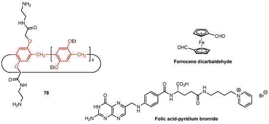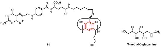 One year later, the same research team described the synthesis of the folic acid-containing calix[4]resorcinol derivative 71 (Figure 21), designed to selectively target cancer cells through interaction with the folic acid alpha receptors which are overexpressed in some tumours [73]. Since 71 was not water-soluble, the addition of a 220-fold excess of N-methyl-D-glucamine was necessary to increase its solubility (through a hydrotropic effect) and thus allow the complexation of the anticancer drug doxorubicin. The activity of 71 and its doxorubicin complex was analysed using M-HeLa cells and human hepatocyte cells (Chang liver cell line). A similar cytotoxic effect on both the cancerous and healthy cells (IC50 = 17.0 and 20.0 µM, respectively) was observed for 71, while the water-soluble complex was more active, with IC50 values of 2.0 µM (HeLa cell line) and 5.0 µM (Chang liver cell line) being found, lower than those observed for pure doxorubicin (IC50 = 5.0 and 6.0 µM, respectively). It is worth noting that the N-methyl-D-glucamine itself did not show any cytotoxicity against both cell lines. The relatively low selectivity displayed by the complex suggests that further investigation is needed to obtain a compound that could be successfully used in cancer treatments while providing high selectivity towards malignant cells over healthy cells.