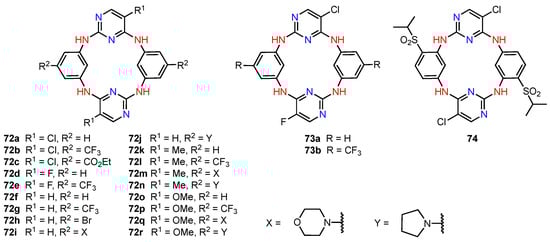 Aiming at combining the versatile calixarene skeleton with the well-known biological activity of 2,4-diaminopyrimidines, Wang, He, and their co-workers designed a series of azacalix[2]arene[2]pyrimidines (72a–r, 73a,b and 74, Figure 22), in which two phenyl and two pyrimidine fragments were joined through -NH- bridges [74]. The target compounds were prepared in two steps from appropriately substituted 2,4-dichloropyrimidines and benzene 1,3-diamines, and their structures were confirmed by NMR spectroscopy, mass spectrometry, and, only for the dichloro derivative 72a, by X-ray diffraction analysis. The twenty-one new azacalix[2]arene[2]pyrimidines were subjected to the CCK-8 colorimetric assay to evaluate their anticancer potential. While most compounds exhibited little to no activity, six products (72g, 72h, 72j, 72k, 72n, 72r) showed significant cytotoxicity (IC50 = 0.58–18.75 μM) for A549 (human lung adenocarcinoma), MCF7 (human breast cancer), and Sy5Y (human neuroblastoma) lines, and lower cytotoxicity (IC50 = 15.6–46.5 μM) for CNE cells (human nasopharyngeal carcinoma). Notably, the most active pyrrolidine-substituted azacalix[2]arene[2]pyrimidine 72j featured inhibitory properties comparable to those of the benchmark drug doxorubicin while being considerably less toxic for the normal human foetal hepatocyte line L-02. Additional tests on the MCF7 cell line shed light on the mechanism of action of this compound, where cell apoptosis through induction of the caspase-3–caspase-9 signalling pathway was detected.