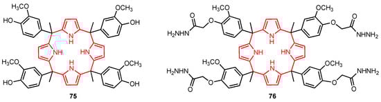 Calix[4]pyrroles have a wide range of applications, including ion recognition and biomedical applications [75], and their cytotoxic activity against certain cancer cell lines has also been reported in the past. In 2022, Kongor, Bhatt, and their co-workers [76] synthesised the calix[4]pyrrole derivatives 75 and 76 (Figure 23) and evaluated their cytotoxicity on HeLa and MCF-7 human cancer cell lines using adriamycin as a positive control. The study showed that 75 had good anticancer activity against HeLa and MCF-7 human cancer cell lines, displaying higher potency than 76. The assays revealed that 75 was very active at concentrations of 10–80 μg/mL. The authors suggested that this behaviour was due to the fact that 75 had more hydrogen bond donor functional groups compared to 76 (with phenolic hydroxyl groups playing the most important role). Although the presence of the OH groups might be the reason for the higher anticancer efficacy of 75, the specific mechanism of action is still unclear. Moreover, since molecular modelling studies showed that 75 can penetrate the quinone reductase-2 pocket, this molecule could be further explored as a potential anticancer drug.
