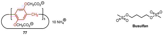 - Xue, H.-F.; Huang, Y.-X.; Dong, M.; Zhang, Z.-Y.; Li, C. Stabilization of Antitumor Agent Busulfan through Encapsulation within a Water-Soluble Pillar[5]arene. Chem. Asian J. 2022, 17, e202101332. [Google Scholar] [CrossRef] [PubMed]