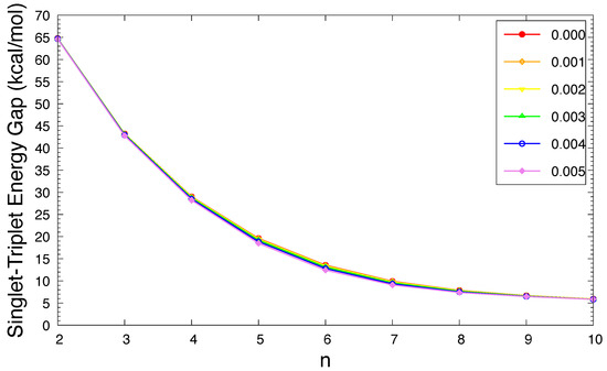 As shown in Figure 2, in an OEEF, the ST gap of n-acene decreases in a monotonic manner with an increasing acene length (also see Table S1 in Supplementary Information (SI)). As the electric field strength F increases, the ST gap of n-acene slightly decreases. For each case (i.e., n and F), the singlet state has lower energy than the triplet state. Therefore, for all the OEEFs considered, n-acenes (n = 2–10) possess singlet ground states. As MR systems generally have small ST gaps [32,33,34,36,37,38,39,40,71,72], the ground states of the longer n-acenes in OEEFs can have MR character.
