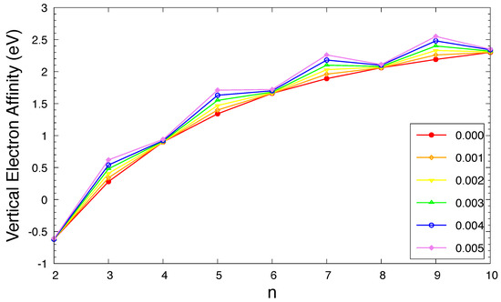 Vertical electron affinity for the ground state of n-acene in an OEEF of the electric field strength F = 0.000, 0.001, 0.002, 0.003, 0.004, and 0.005 a.u., calculated using spin-unrestricted TAO-LDA.