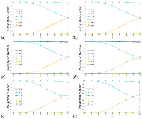Occupation numbers of active orbitals for the ground state of n-acene in an OEEF of the electric field strength F = (a) 0.000, (b) 0.001, (c) 0.002, (d) 0.003, (e) 0.004, and (f) 0.005 a.u., calculated using spin-restricted TAO-LDA. Here, the HOMO/LUMO is denoted as the H/L for brevity.