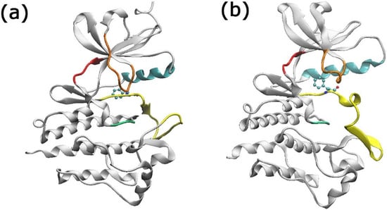 The BCR-ABL enzyme in its (a) DFG-in (PDB: 2GQG) and (b) DFG-out (PDB: 3QRJ) conformations. Color code: P-loop orange, c-alpha helix cyan, hinge red, catalytic loop green, and activation loop yellow. The Phe382 residue is shown in the CPK representation.
