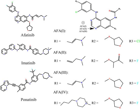 Representation of the 2D molecular structures of afatinib, imatinib, and ponatinib, and the afatinib derivatives, AFA(I), AFA(II), AFA(III), and AFA(IV).