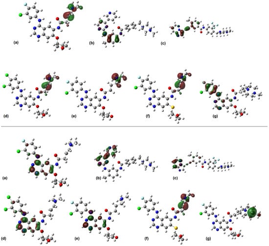 Isosurfaces of the frontier orbitals of (a) afatinib, (b) imatinib, (c) ponatinib, (d) AFA(I), (e) AFA(II), (f) AFA(III), and (g) AFA(IV) at B3LYP/6-311+G(d,p) level. The HOMO isosurfaces are depicted at the top, and the LUMO isosurfaces at the bottom. The images were rendered with an isovalue of 0.05 e-.Å−3.