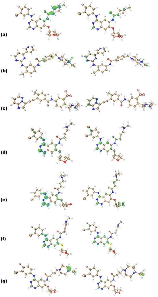 Fukui functions (f− at the left, f+ at the right) of (a) afatinib, (b) imatinib, (c) ponatinib, (d) AFA(I), (e) AFA(II), (f) AFA(III), and (g) AFA(IV) at B3LYP/6-311+G(d,p) level. Positive regions are represented in green, while negative regions are presented in cyan. Rendering was obtained with an isovalue of 0.005.