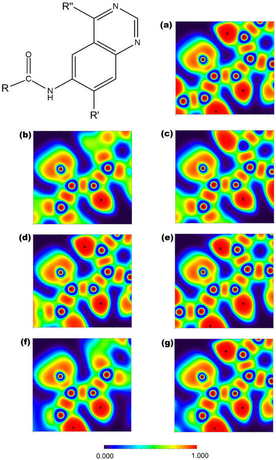 Plotting of the 2D-Electron Localization Function around the central amide moiety at B3LYP/6-311+G(d,p) level. The scaffold represents the afatinib derivatives. (a) afatinib, (b) imatinib, (c) ponatinib, (d) AFA(I), (e) AFA(II), (f) AFA(III), and (g) AFA(IV).