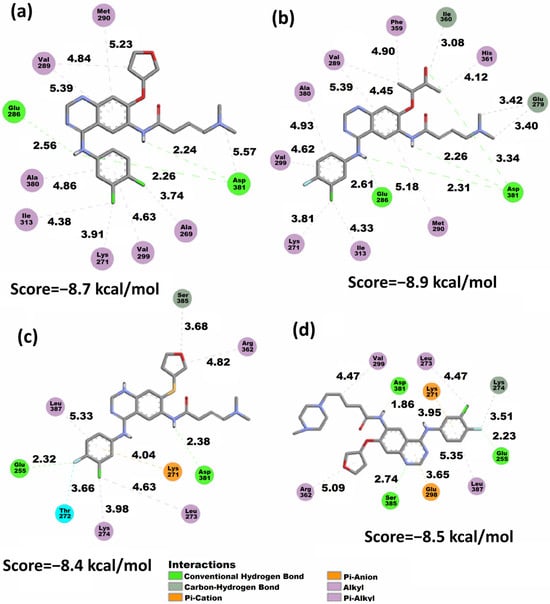 The studied molecules can be divided into four regions, as shown in Figure 5: the R1, R2, and R3 groups and the central aromatic rings. Upon analyzing the scores obtained through the docking studies, the modifications improved the score compared to afatinib. The most effective modification was the addition of a methylpiperazine ring R1 group of afatinib molecule, generating the AFA(IV) candidate, which provided a score of −9.0 kcal/mol against the imatinib-resistant protein, further suggesting the importance of the methylpiperazine moiety. None of the modifications were effective against the imatinib-susceptible BCR-ABL isoform. Although an improvement could be identified compared to afatinib, none of the derived molecules posed a significant upgrade over ponatinib or imatinib. Nevertheless, considering the improving results when compared to afatinib, there is an indication that the modifications, especially in the case of the AFA(IV), pose a first step into the development of a new derivative with the potential to inhibit the BCR–ABL enzyme. This reinforces the versatility of afatinib as a starting point for the design of derived molecules that can be effective against other receptors as well as its original target [76].