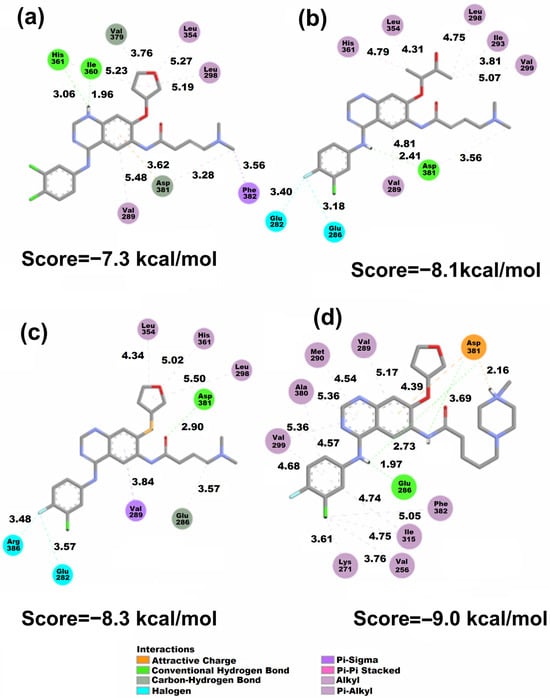 To better understand the deviations presented by the scores provided by the docking simulations, the profile of some important interactions was thoroughly observed. Specifically, we have calculated the smallest distances between the atoms of the ligands and the closest atoms of the key residues Thr/Ile315, Met318, Arg386, Asp381, Phe382, Gly383, and Glu286, as shown in Figure 10 and Figure 11. The stacked bar graph values are normalized and refer to the smallest distance. These residues are frequently involved in important interactions involving the target enzyme and all ligands, possibly modulating the energetic effectiveness of the complex.